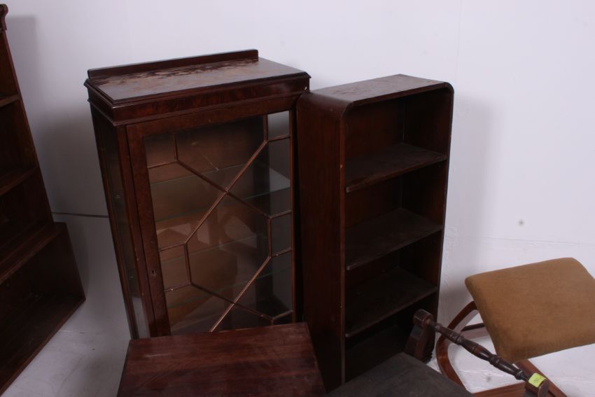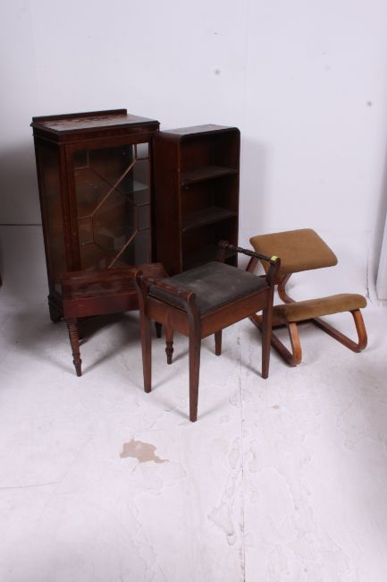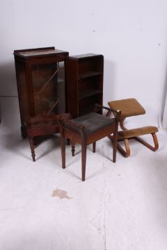 A 1930's Art Deco oak upright open window bookcase shelves together with an Edwardian piano stool with hinged lid seat on turned supports. Measures: 108cms x 48cms x 20cms, along with a Victorian bidet stool and a Danish posture stool