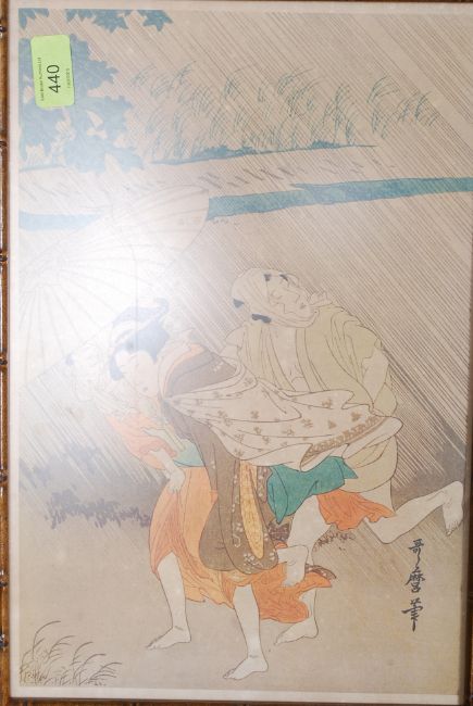 Five vintage Chinese oriental framed prints, each within a decorative faux bamboo style carved wood frame.