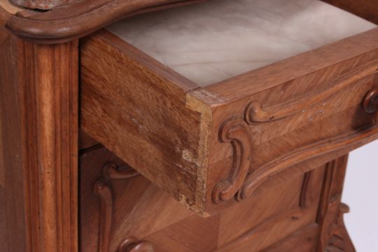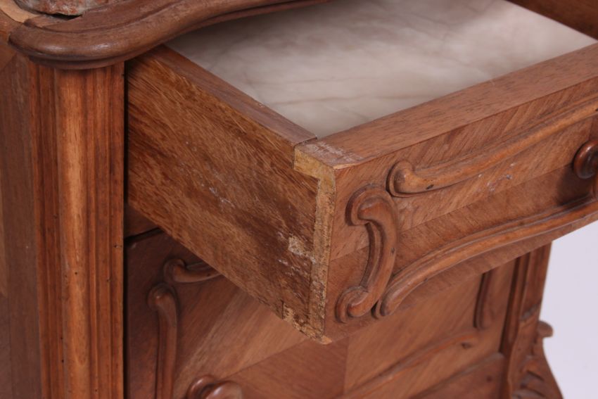 An early 20th century marble top French bedside cabinet having rouge marble inset top with locker beneath, all raised on shaped supports