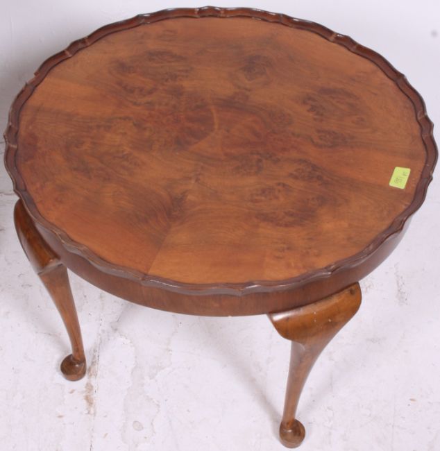 A Queen Anne walnut coffee / occasional / lamp table being raised on cabriole legs together with a hardwood carved coffee table. Measures: 43cms x 56cms