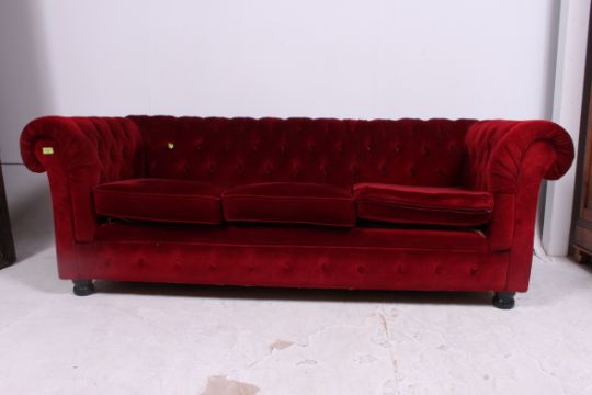 An antique style 20th century Chesterfield sofa raised on bun feet having red velour button backed upholstery. Measures: 69cm x 190cm x 85cm.