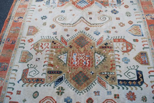 A large fine quality Persian style rug having central cream ground with medallion and red marble to sides