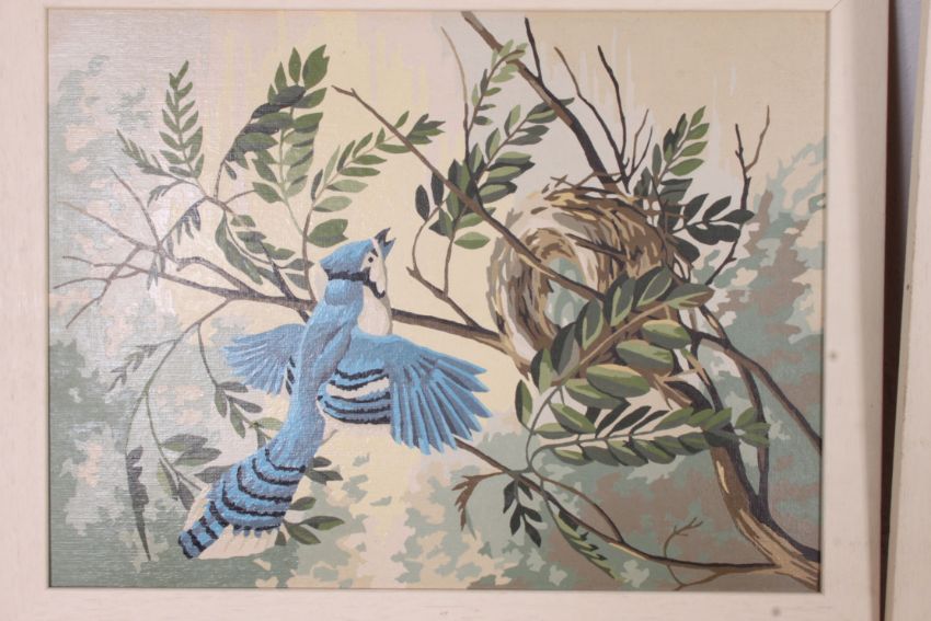 A pair of 1950's oil on board / panels paintings of birds by Melita Robinson - being signed with notation to verso. Set within original white frames. Measures: 29cm x 40cm.