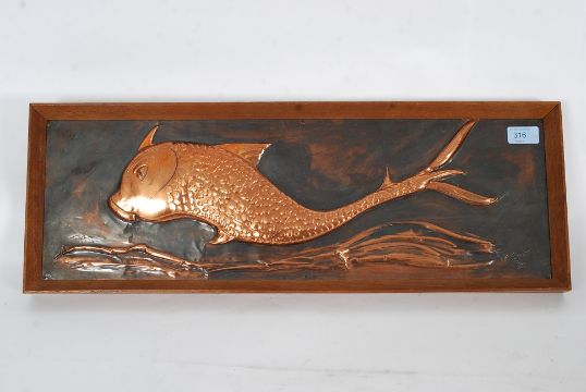 A retro teak framed copper work reprosse of a fish signed R Dent 1972