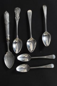 A colllection of silver hallmarked spoons to include a pair of chase decorated Georgian tea spoons for London 1798 by John Lambe and others to include makers George Smith and Thomas Hayter, william Clarke Shaw ( six in total )