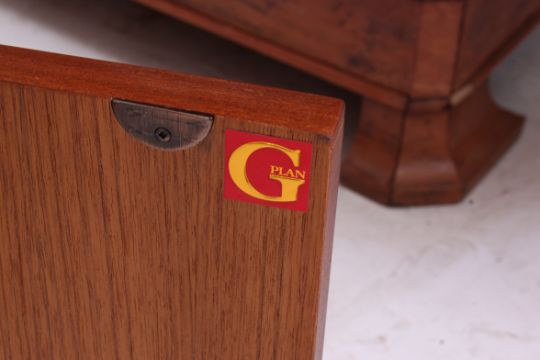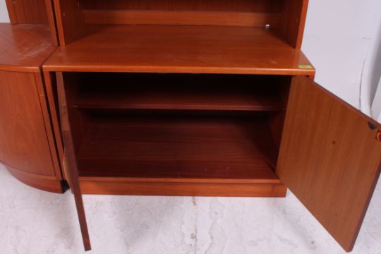 A G-Plan teak wood sideboard display cabinet having sectional upright body with corner unit. h=200 by w=119 by h=49
