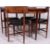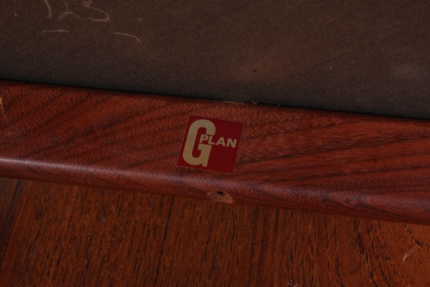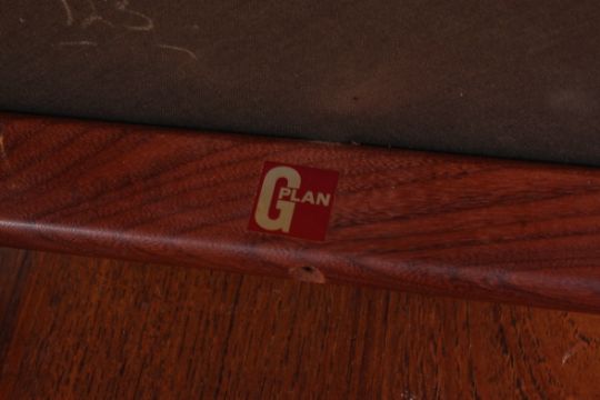 A teak G-plan dining table and 4 dining chairs designed in the manner of Koford Larsen. Raised on tapered turned legs with the chairs having stretchers with overstuffed original upholstered faux leather seats and back rests (4) h=72 by w=121 by d=121