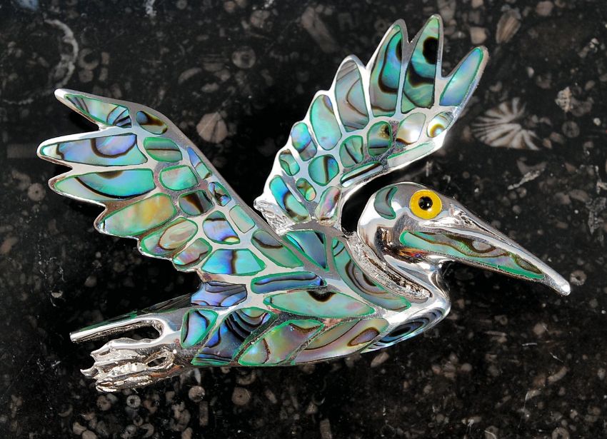 A 20th century silver 925 ladies abalone set brooch in the form of a stork