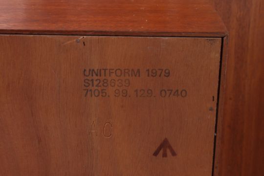 A pair of 1960's retro teak wood Air Ministry open window bookcase cabinets having shelved centres each marked to the back panels. Further matching 2 in lot 1130. H=107 by W=76 by D=23