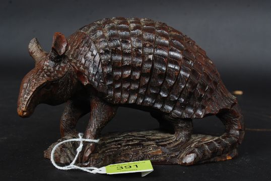 A carved South American hardwood tribal figurine on an Armadillo