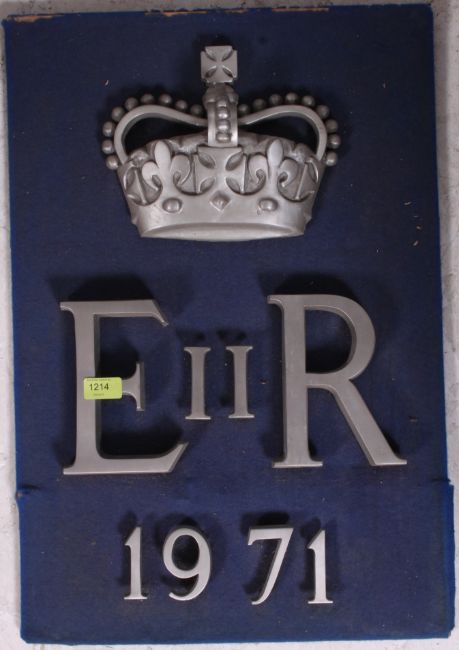 A vintage (believed Police related ) wall plaque - ER II - 1971 with crown to the top. The raised wooden lettering on a cloth covered board base.