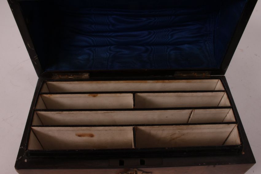 A Georgian domed top walnut stationery box chest, with brass decoration applied to top, with a removable sectioned interior, complete with the key.