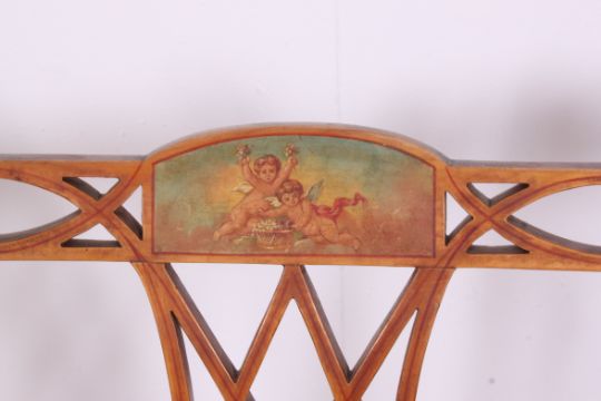 A set of 4 fine Edwardian marquetry hand painted satinwood dining chairs in the manner of Edwards & Roberts. The recaned central seats raised on faux bamboo front legs with stunning stencil handpainted decoration to the pierced backs