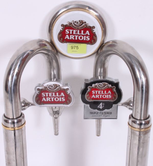 A twin Stella Artois beer pump with notation panels to each pump finished in chrome. h=75 by w=39 by d=37