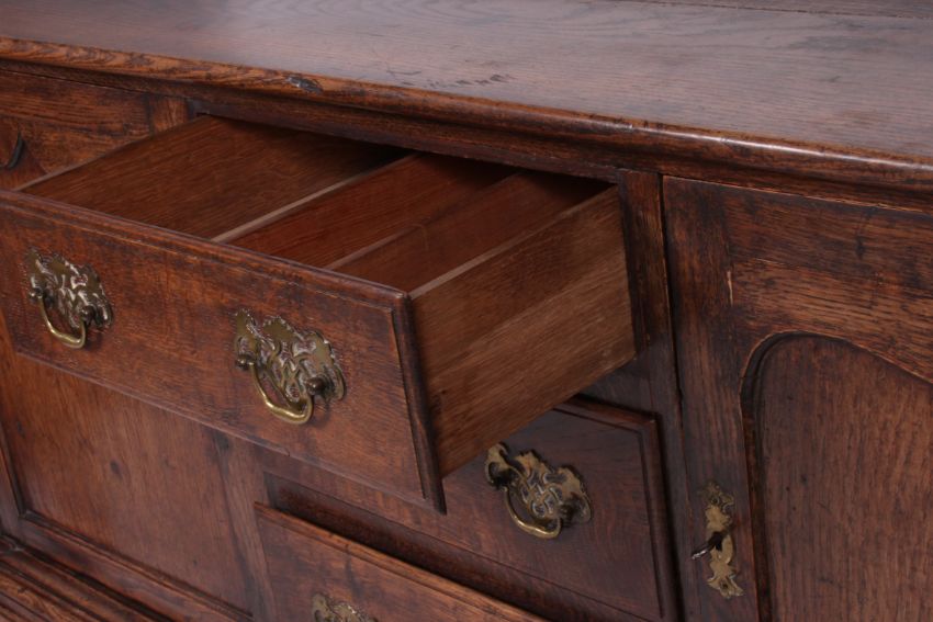 An 18th century and later country Georgian oak housekeepers cupboard being converted to a sideboard having a base with bracket feet and 3 deep drawers with a further 2 cabinets having a bank of drawers to centre. Finished with a flared top above