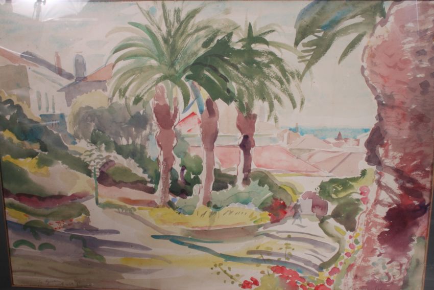Russell Sidney Reeve RBA 1895-1970. Portugese watercolour painting being signed by the artist having notation to lower right ' To Gwen with love from Russell ' The other corner with name of location in Portugal. Measures 36 cms x 56cms