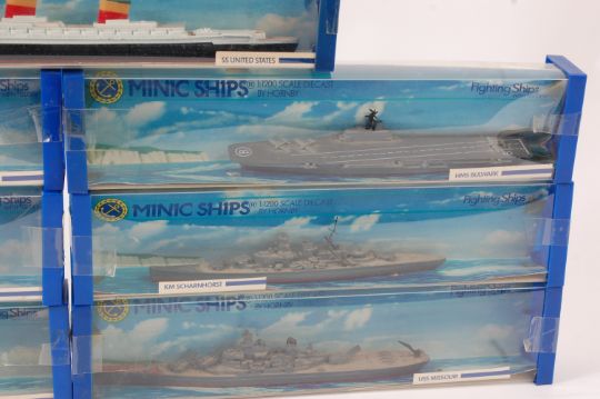 MINIC SHIPS; A collection of 7x original vintage Hornby 1:1200 scale Minic Ships (6x being Fighting Ships, the other one being a Famous Liner). Comprising of HMS Vanguard, IJN Yamato, KM Bismarck, SS United States, HMS Bulwark, KM Scharnhorst and USS Missouri. Each within their original plastic display boxes.
