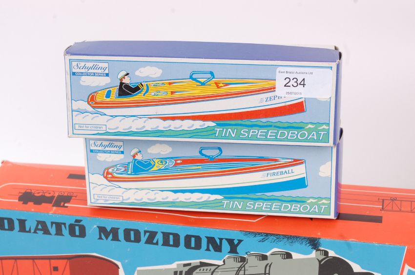 TINPLATE TOYS; A collection of 4x vintage tinplate boxed toys to include a Russian clockwork train track (complete and working) along with 2x Schylling clockwork boats and a '1927 Road Roller' also with original box.