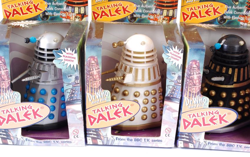 DOCTOR WHO; A collection of 3x Product Enterprise battery operated reissue Daleks. Comprising of; blue and silver, gold & white and black & gold. Each presented within their original boxes.