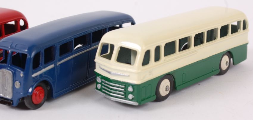 DINKY; 3x original Dinky diecast coaches; 2x 282 Leyland Royal Tiger (one red and silver, the other in green and cream) along with a Dinky Luxury Coach in blue and silver. FROM AN AMAZING COLLECTION OF ORIGINAL PROFESSIONALLY REPAINTED DINKY DIECAST. All models are in superb condition, each being professionally restored to original colours, with new tyres and accessories where needed. The standard is high, and many are better than when they were first made. Incredible attention has been given. Some of the best re-painted Dinky's we have ever seen.