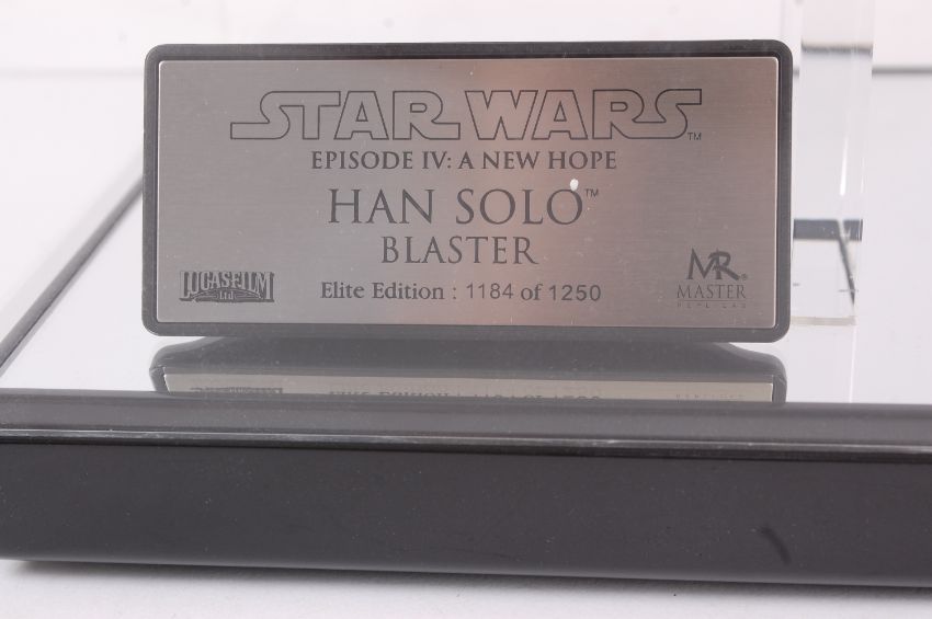 STAR WARS MASTER REPLICAS; A 1:1 scale highly detailed Master Replicas Star Wars Episode IV A New Hope ' Han Solo Blaster ' limited edition prop replica gun. 1184 / 1250. Note; from an impressive private collection of Master Replica Star Wars props / helmets / lightsabers. Each (unless stated) is 'as new' and comes complete with all interior packaging, certificates, accessories and original presentation cases, cardboard boxes and shipping boxes. All are limited edition.