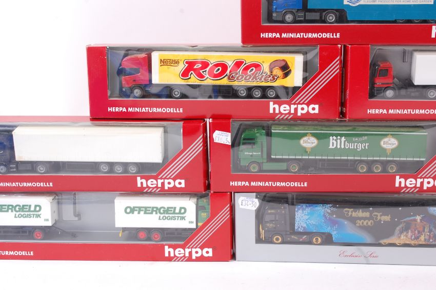 HERPA; A collection of 9x Herpa 1:76 scale diecast model advertising lorries and trailers. Each within the original boxes. Note; from an extensive private collection of 1:76 scale ( 00 Gauge ) Herpa (and some other) diecast models. All are lorries, cabs and trailers. Some appear to be Code 3 custom made. Each are within their original boxes, most never having been removed from their boxes. Although the vast amount of the collection are 'as new' buyers are reminded to satisfy themselves as to condition prior to bidding.