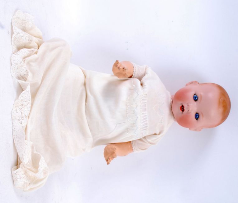 ARMAND MARSEILLE; An antique AM Armand Marseille bisque headed dolly. Articulated arms and legs with a fabulously detailed painted face. The rear of the head impressed AM 351/7k. 22" approx in height.