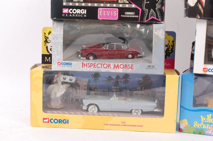 TV / FILM RELATED CORGI; A collection of 6x Corgi TV / Film related model diecast cars, each boxed. Comprising of; 39902 Marilyn Monroe, 01803 Inspector Morse, 39901 Elvis Presley, 00802 Fawlty Towers, 00502 Z Cars, and CC05801 The Beatles Yellow Submarine.