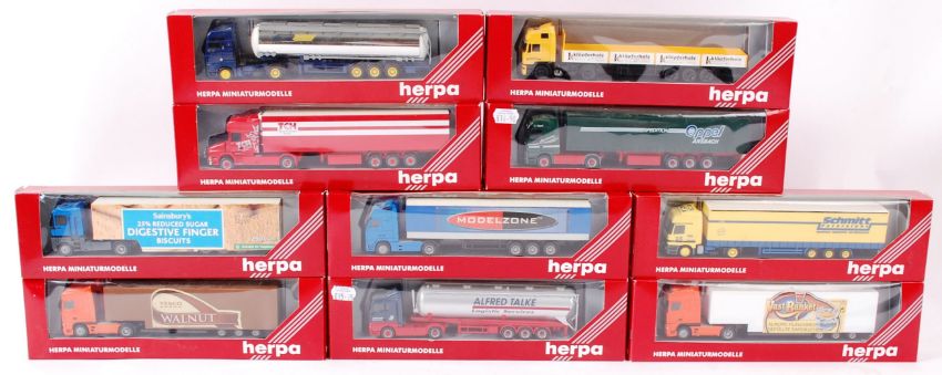 HERPA; A collection of 10x Herpa 1:76 scale diecast model advertising lorries and trailers. Each within the original boxes. Note; from an extensive private collection of 1:76 scale ( 00 Gauge ) Herpa (and some other) diecast models. All are lorries, cabs and trailers. Some appear to be Code 3 custom made. Each are within their original boxes, most never having been removed from their boxes. Although the vast amount of the collection are 'as new' buyers are reminded to satisfy themselves as to condition prior to bidding.