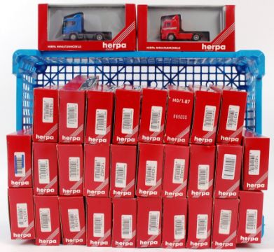 HERPA; A collection of 30x Herpa 1:76 scale diecast model advertising lorry cabs. Each within the original boxes. Note; from an extensive private collection of 1:76 scale ( 00 Gauge ) Herpa (and some other) diecast models. All are lorries, cabs and trailers. Some appear to be Code 3 custom made. Each are within their original boxes, most never having been removed from their boxes. Although the vast amount of the collection are 'as new' buyers are reminded to satisfy themselves as to condition prior to bidding.