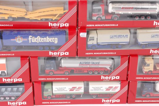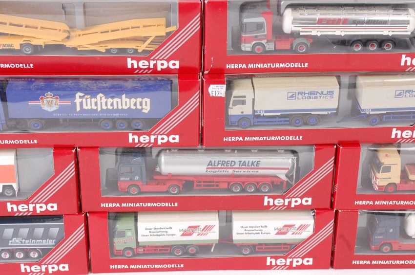 HERPA; A collection of 10x Herpa 1:76 scale diecast model advertising lorries and trailers. Each within the original boxes. Note; from an extensive private collection of 1:76 scale ( 00 Gauge ) Herpa (and some other) diecast models. All are lorries, cabs and trailers. Some appear to be Code 3 custom made. Each are within their original boxes, most never having been removed from their boxes. Although the vast amount of the collection are 'as new' buyers are reminded to satisfy themselves as to condition prior to bidding.