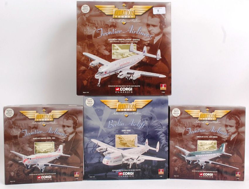 CORGI AVIATION ARCHIVE; A collection of 4x Aviation Archive diecast model planes, each within their original display boxes. Appearing unopened. 47104, 47201, 47103 and 47502. All 1:144 scale. Note: from an impressive private collection of Corgi Aviation Archive diecast model aeroplanes, helicopters and military aircraft. The vendor has checked all the lots for completeness, but buyers are reminded to satisfy themselves.