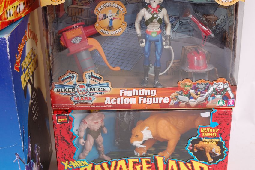 ACTION FIGURES; A great selection of action figures, each within the original boxes, comprising of; Wallace & Gromit Curse Of The Wererabbit figure, Doctor Who Face Of Boe, 2x Biker Mice From Mars sets, Marvel X-Men Savage Land set. Each within the original boxes, most unopened / unused.