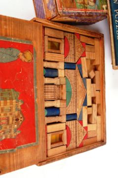 EDWARDIAN TOYS; A collection of three antique Edwardian childrens toys / games, comprising of: a GWR Torbay Express wooden piece jigsaw puzzle within the original box, a cubed jigsaw puzzle, complete, and with the various images on paper also appearing to be complete and a building blocks set within the original box with paper label.