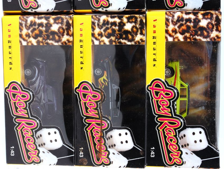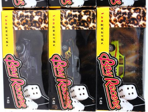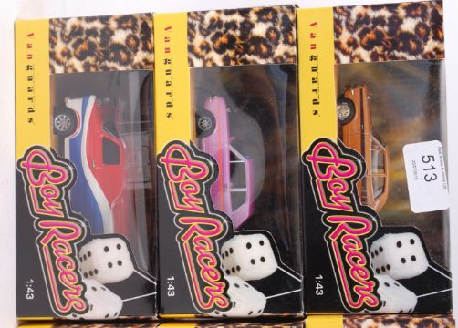 VANGUARDS; A collection of 6x Vanguards 1:43 scale diecast model cars from the ' Boy Racers ' series; VA08701, VA04108, VA06614, VA02614, VA00123 and VA07201. Each within the original box, unused.
