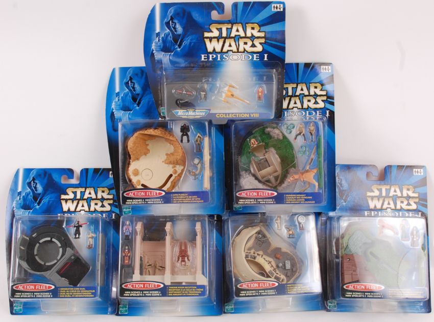 STAR WARS; A collection of 7x Star Wars Hasbro Micro Machines and Action Fleet miniature playsets, all Episode 1 related, and all appearing to be unused.