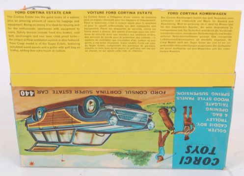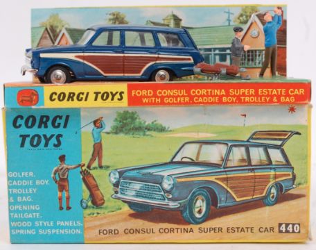 CORGI; An original vintage diecast model Corgi 440 Ford Consul Cortina Estate, complete within a good original box with both figures, and the golf bag. Comes within the original box, with inner cardboard packaging slip and display plinth. Note; from a large private collection of original vintage Dinky / Corgi diecast cars. Most are in wonderful condition, within good boxes. Condition generally varies from good to excellent, but there are some more playworn. Some have never been removed from the box and as such are 'mint.' Although all are generally great, buyers are reminded to satisfy themselves as to condition prior to bidding