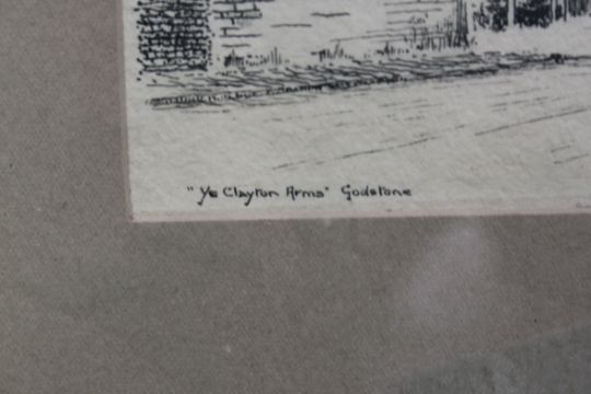 Pen and ink sketch of Ye Clayton Arms signed by artist framed and glazed H11 W13cm Cost of postage and packaging is £15.99 plus VAT on a tracked and recorded service. Combined postage available. World Wide and European service please enquire by email.