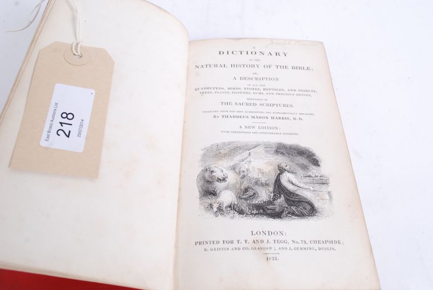 A Dictionary of the Natural History of the Bible or a Description of all the Quadrupeds Birds Fishes Reptiles and Insects Tress Plants Flowers Gums and Precious Stones by Thaddeus Mason Harris, D.D 1833.Printed for T T and J Tegg No. 73 Cheapside and others in Glasgow and Dublin. Hardcover .