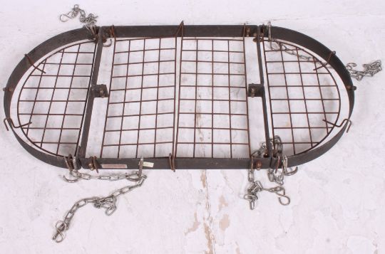 A vintage style kitchen ceiling hanging organiser with baskets and hooks. measures H=80 by W=67 by D= 3