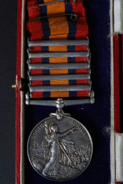 A Queens South Africa Medal with bars to include Laing's Nek, Transvaal, Tugela Heights, Orange Free State & Relief of Ladysmith being for 3086 Pte WF Allen Devon Regt - Devon Regiment having ghosting marks to the front