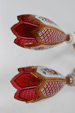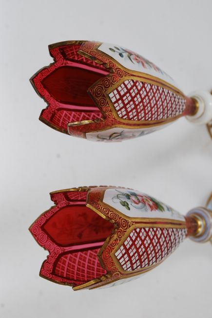 A pair of Bohemian 19th Century Bohemian tulip vase in the manner of Moser with spread foot, knopped stem and tall body cased in opal over ruby and cut with repeat panels over enamel and gilt decorated with flowers, foliage and scroll work