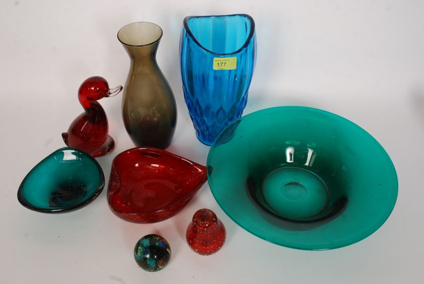 A collection of studio art glass to include fruit bowls, paperweights, control bubble bowl, vases and a duck