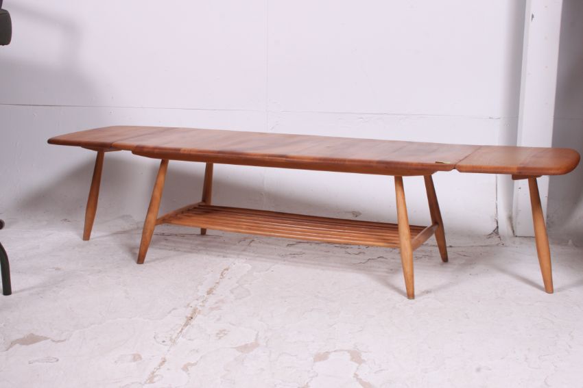 A very rare Ercol double extending drop end coffee table, solid Elm top, Beech frame and magazine rack with the original Ercol label