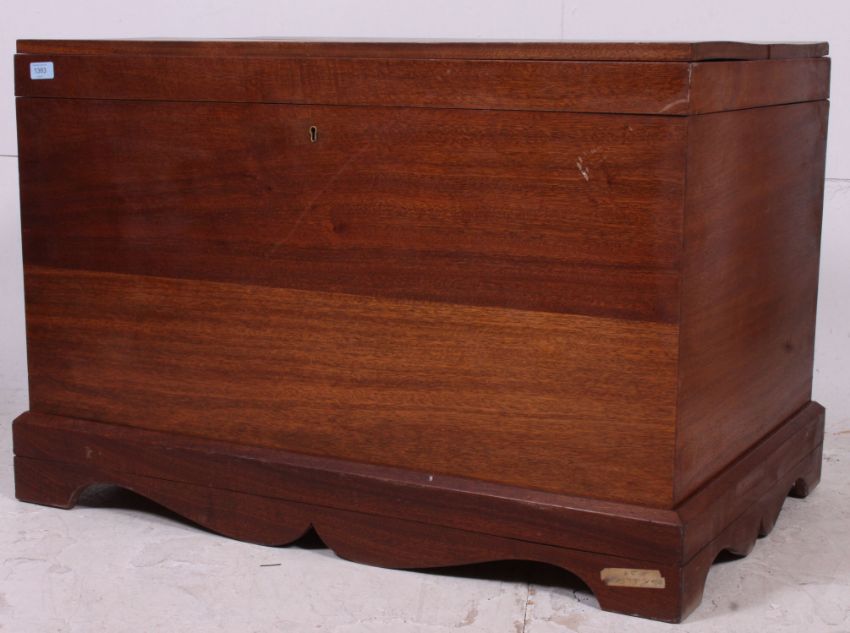A 20th century large anglo Indian teak wood coffer - blanket box chest. The plinth base with hinged top having open interior. Measures 63cms x 95cms x 65cms