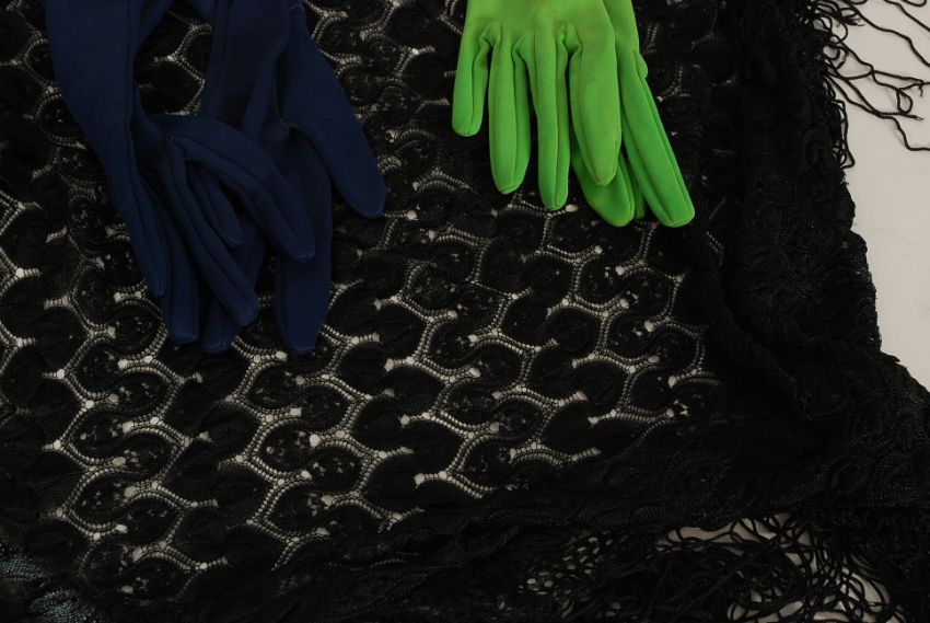 A decorative early 20th century black lacework shawl together with ladies evening gloves in various colours, circa 1950's etc