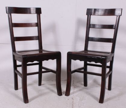 A pair of 19th century Chinese hardwood dining chairs having squared legs with peripheral stretchers having panelled seats with railed back rests