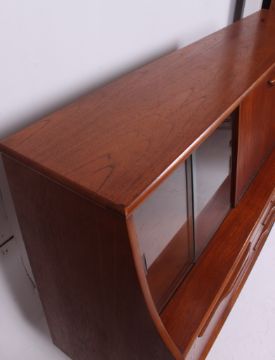 A 1970's retro G-Plan teak wood sideboard raised on tapered supports having a series of drawers and cupboards with glass sliding cabinets atop. H=105 by W=166 by D=44