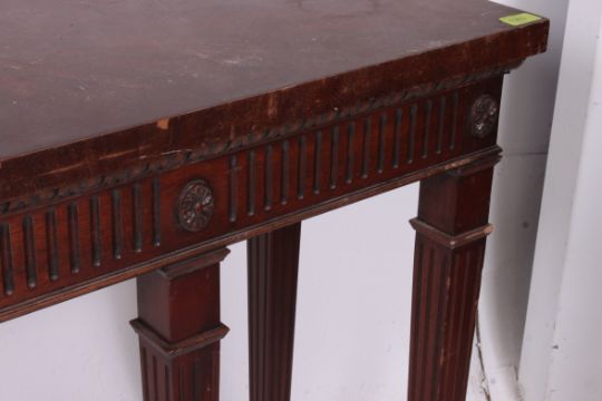 A Regency Irish style mahogany console table having reeded tapered legs with spade feet having reeded fitted frame and flared top above