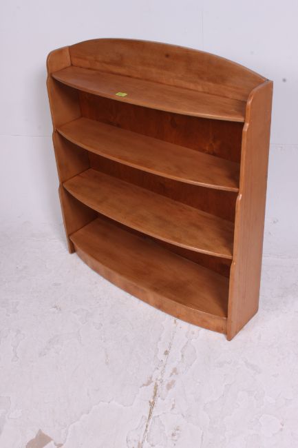 A good quality 20th century beech wood bow front open window bookcase cabinet having central shelves with gallery top